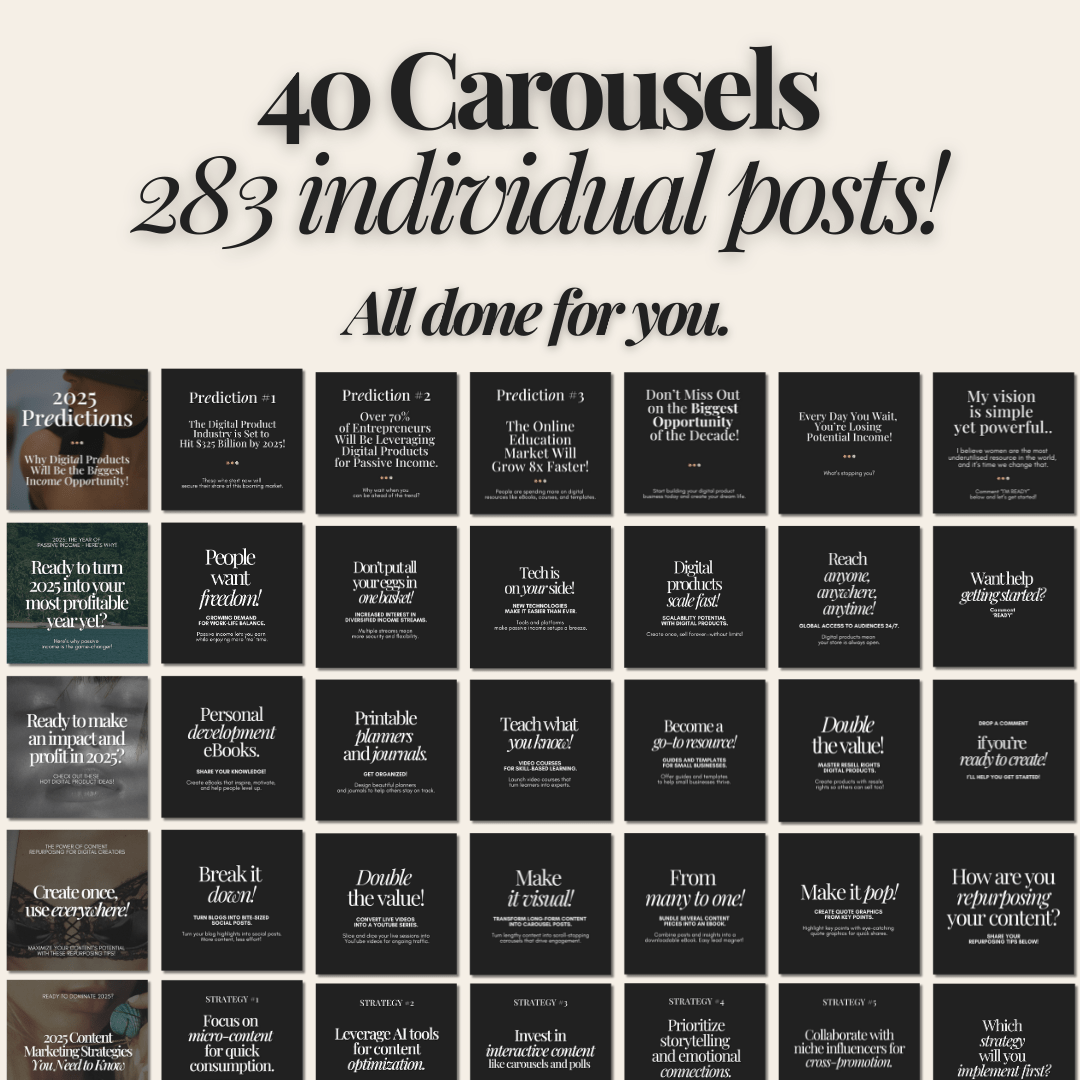 With 40 done-for-you carousels (283 individual posts!), you’ll have a complete content arsenal ready to boost engagement fast. Plus, with the included step-by-step guide, you’ll learn how to execute this strategy flawlessly, ensuring every post counts. This is for the serious growth-minded individual who’s ready to see real, measurable growth — fast.